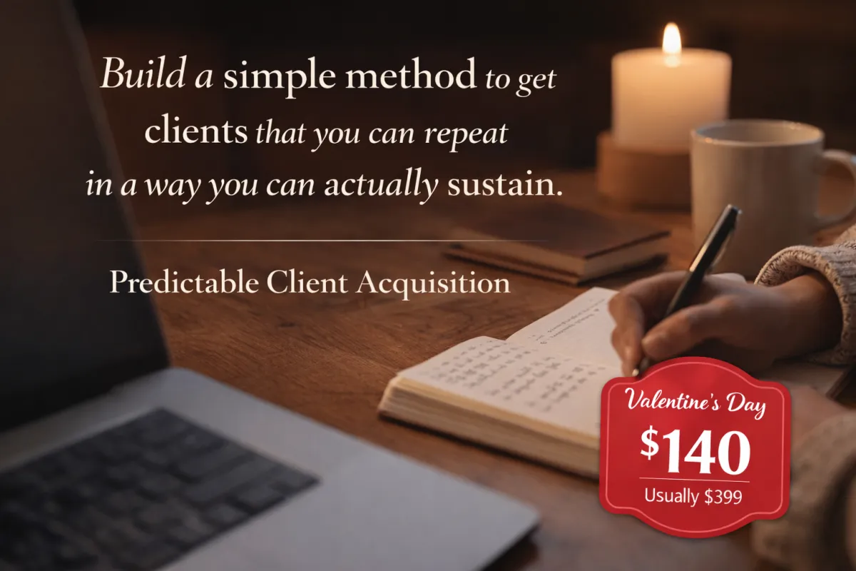 Predictable Client Acquisition teaches a simple sequence for turning quiet interest into paying clients. It shows you how to speak to people who are already paying attention and how to show up in a way that feels steady instead of stressful. The goal is to build a client method you can actually repeat, rather than something you run once and abandon because it does not fit your life.